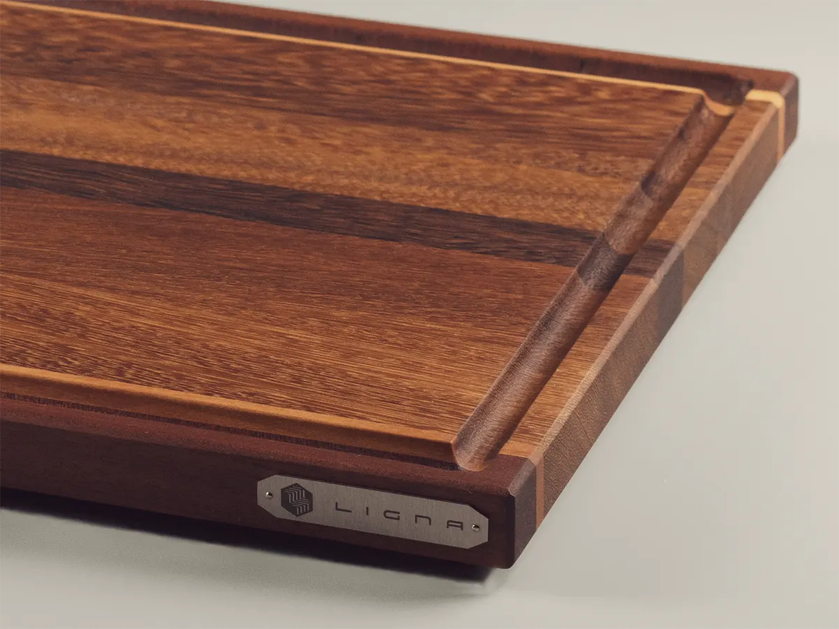 Chroma presenta en una tabla a veta de gran tamaño los contrastes tonales entre las maderas de Sucupira, Iroko, Arce Duro y Sapeli en un diseño elegante con ranura para jugos.