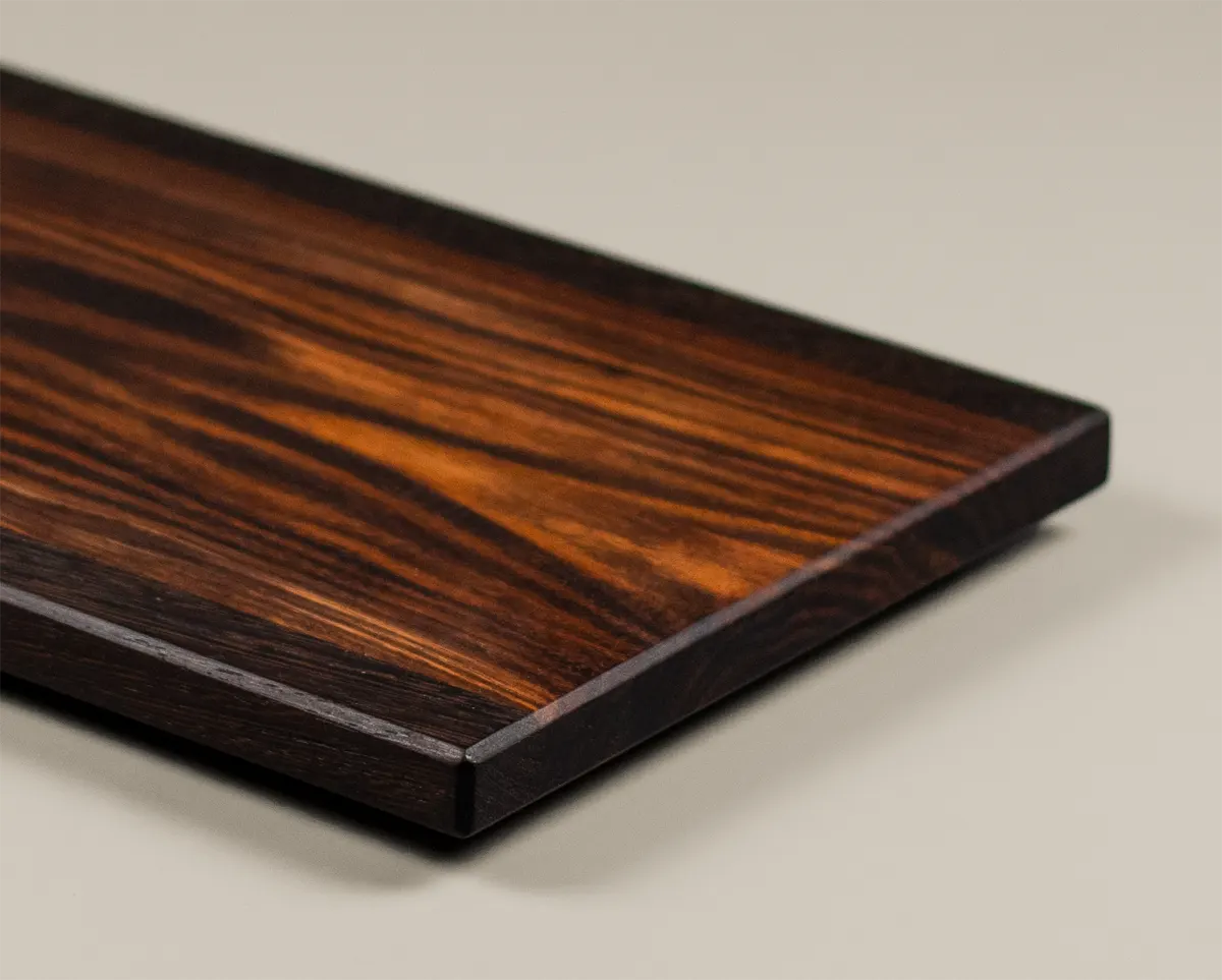 La tabla para quesos y embutido NUBILA presenta las intensas vetas de la madera de Curupay enmarcadas en Wengué